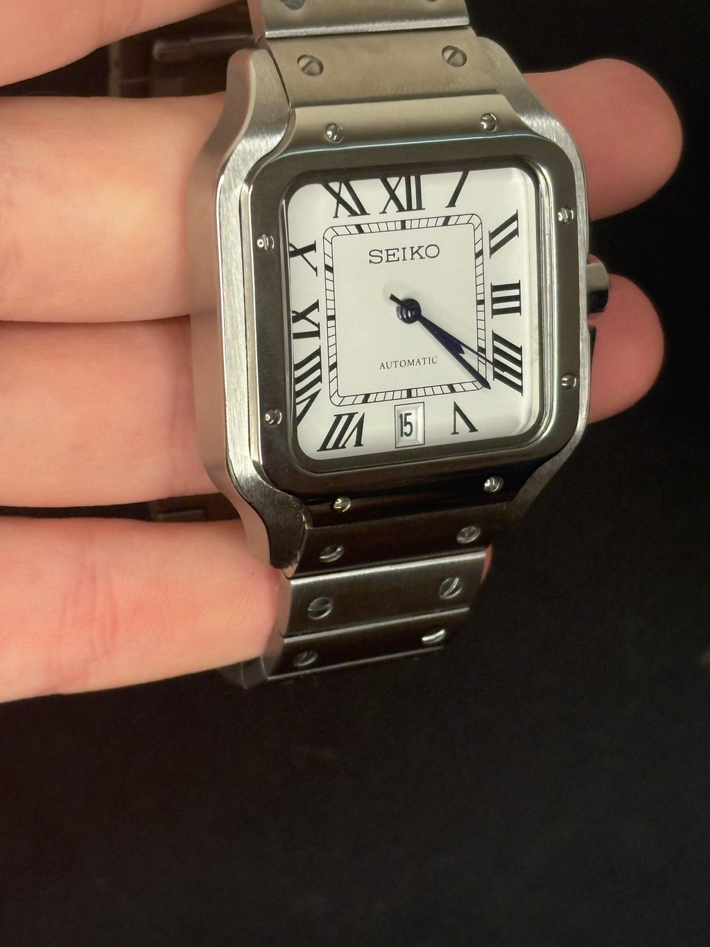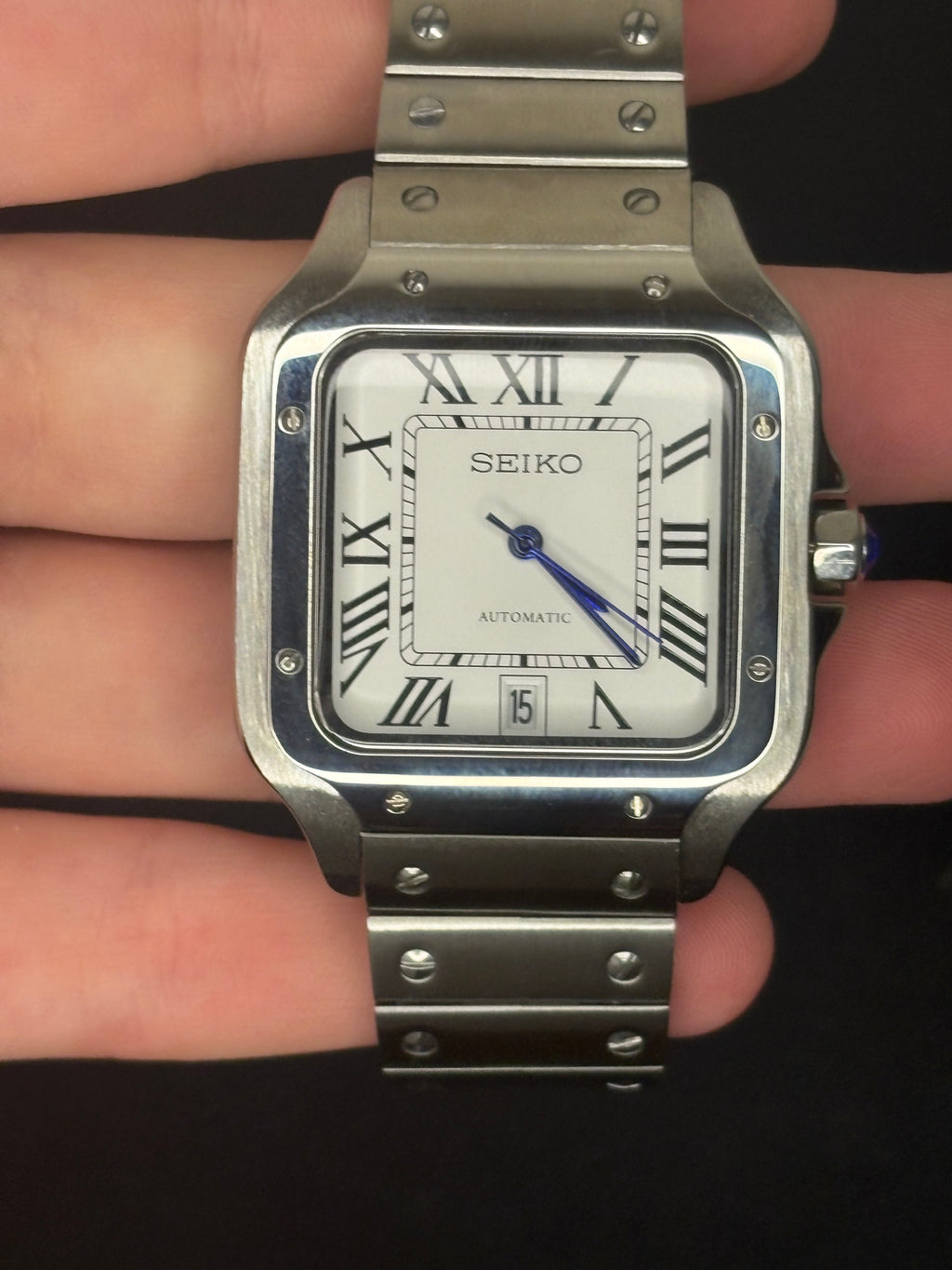 Inspired by the iconic Santos design, and featuring the prestigious Seiko NH35 automatic movement, we present the Seiko Mod Santos. A 38 mm high-end quality watch combining the perfect alliance between excellence and accessibility.